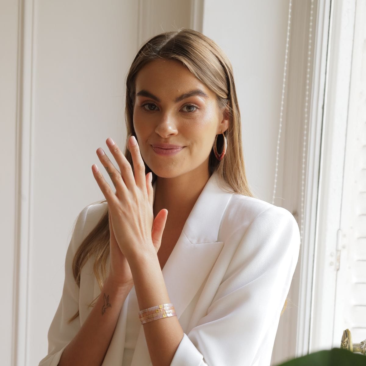 La gran mayoría de nuestras pulseras están montadas sobre un hilo elástico coreano ultra resistente, fácil de poner y muy cómodo para el día a día, sin cierre metálico. Esto les aporta un efecto “segunda piel” que nuestras clientas adoran. ✨