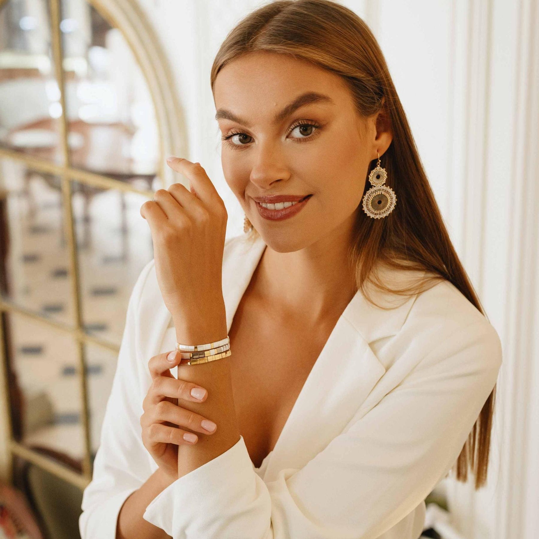 La gran mayoría de nuestras pulseras están montadas sobre un hilo elástico coreano ultra resistente, fácil de poner y muy cómodo para el día a día, sin cierre metálico. Esto les aporta un efecto “segunda piel” que nuestras clientas adoran. ✨
